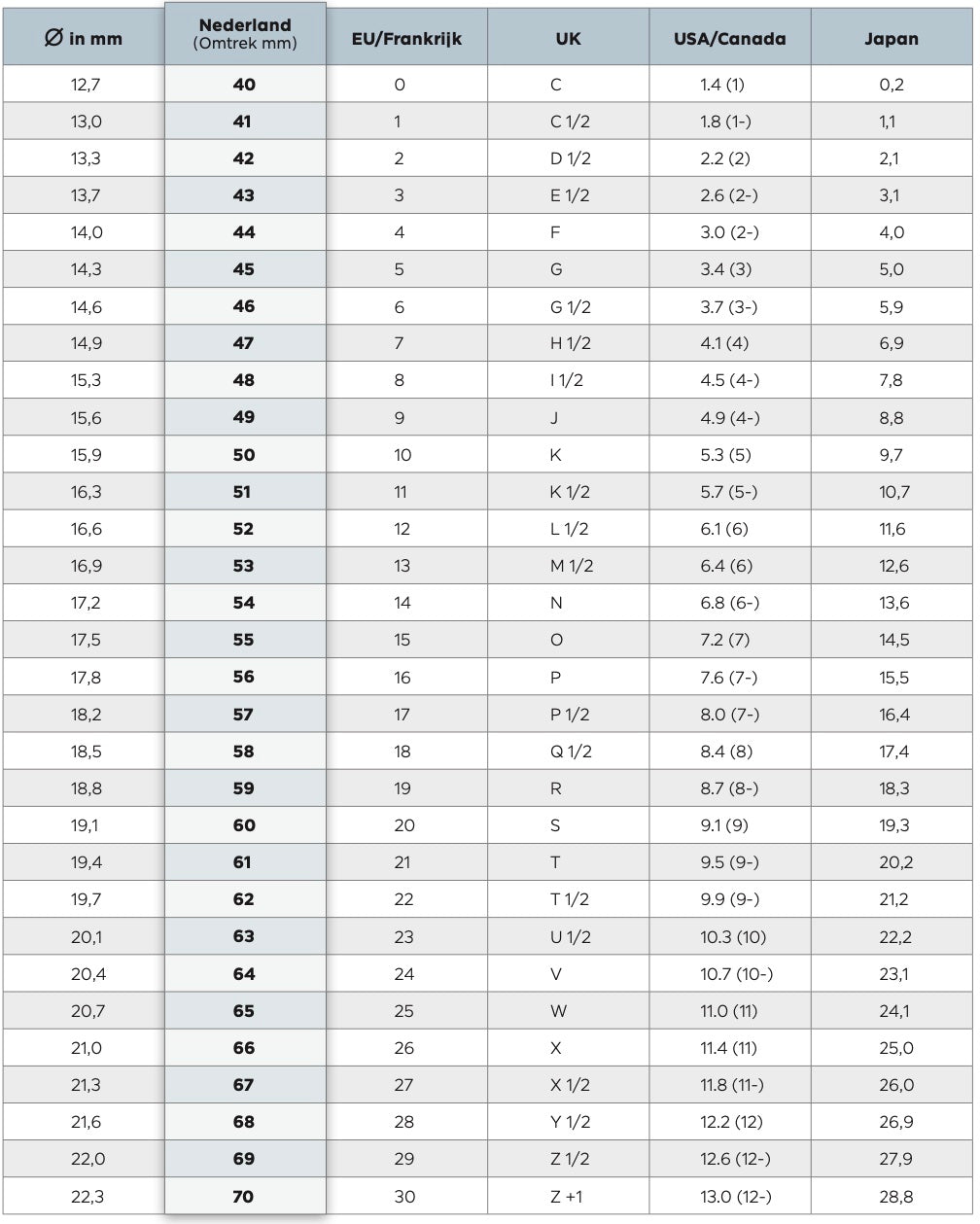 | Size | Circumference |
