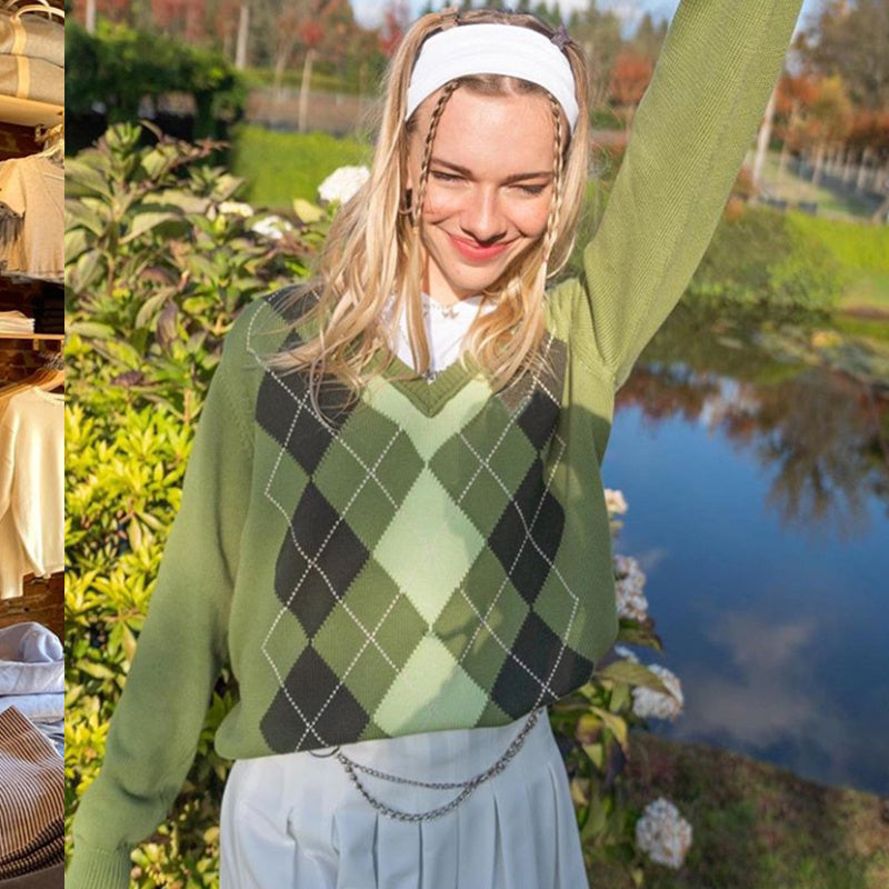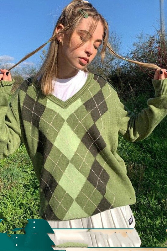 American Street Vintage Groene V-hals Diamant Trui voor Dames & Meiden
