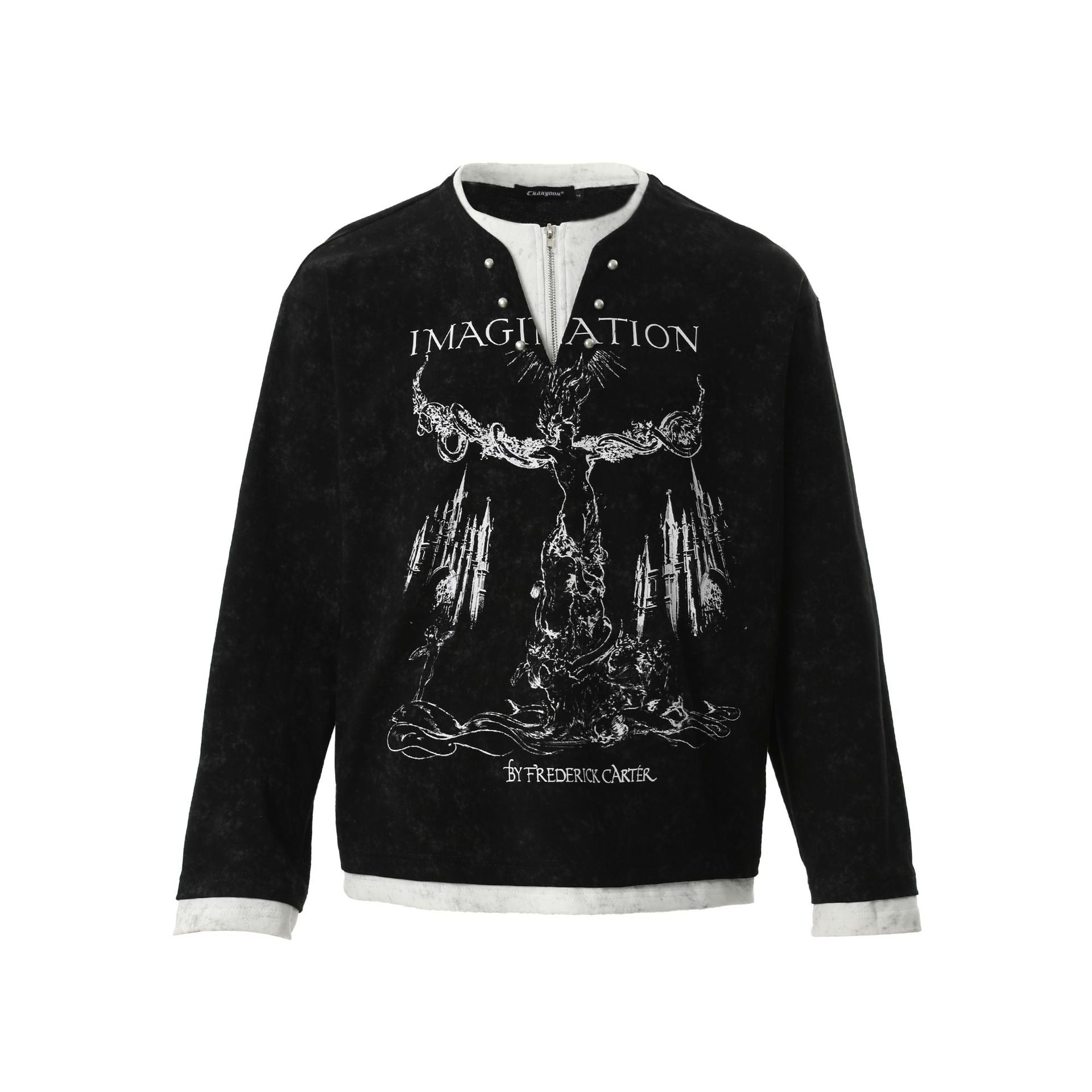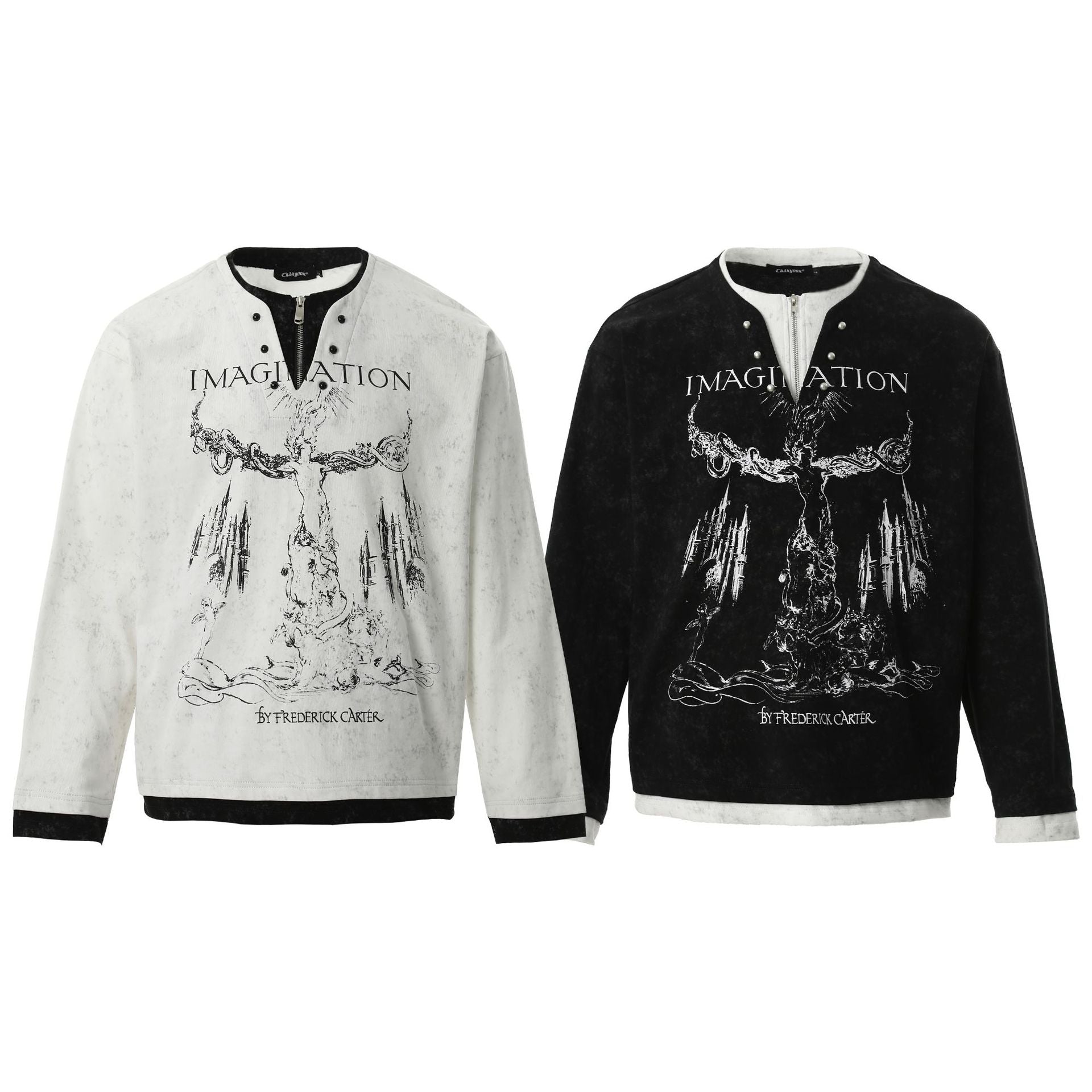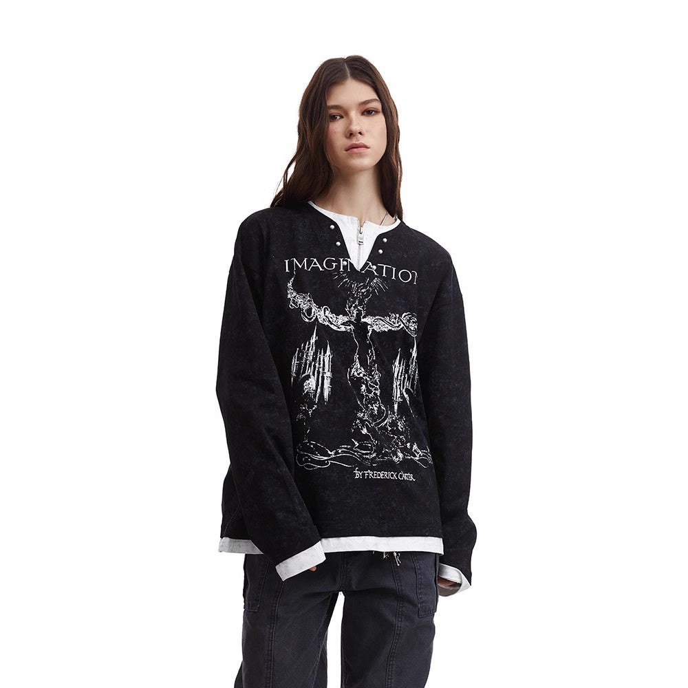 Amerikaanse Retro Punk Bedrukte Long Sleeve Tweedelig T-shirt met Parelknoopsluiting en V-hals voor Unisex