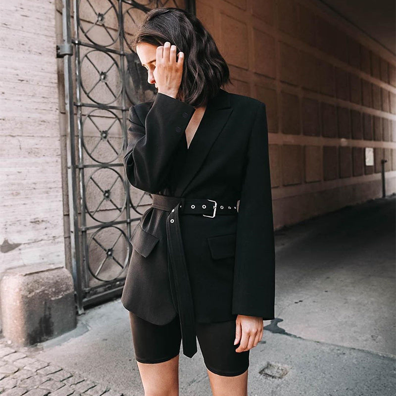 Lange Zwarte Blazer-jas met V-hals en Sjerp voor Dames