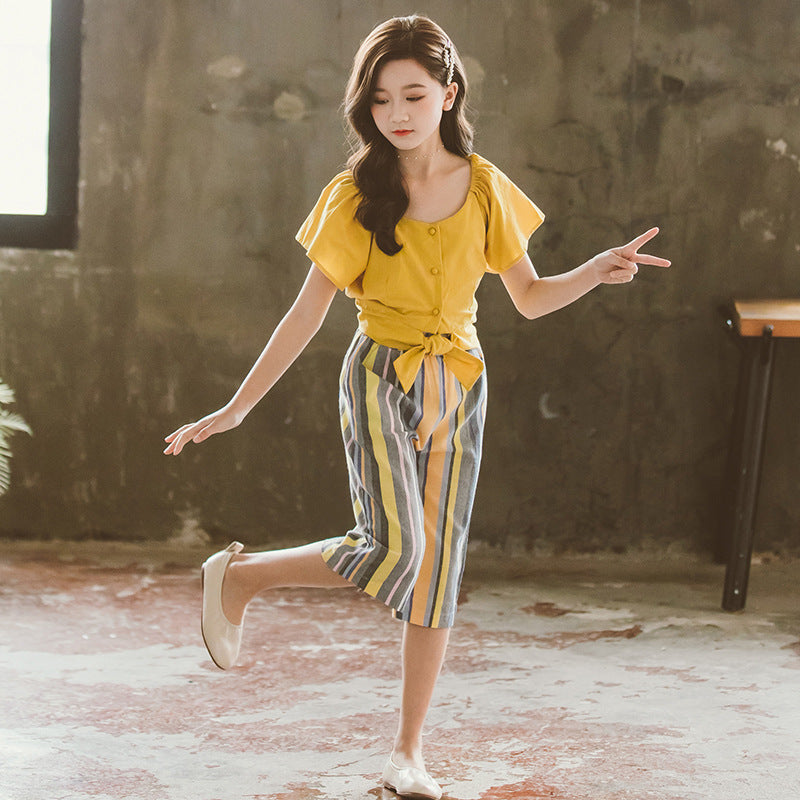 Trendy Tweedelig-Pak voor Meisjes Gestreepte Wijde Broek & Bloese met Knoop