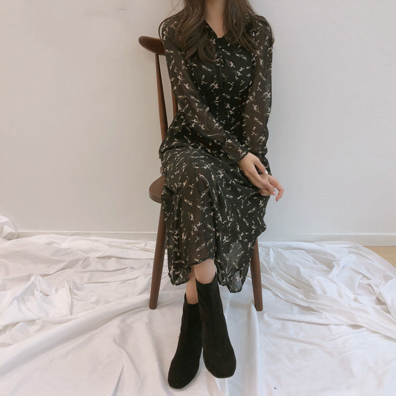 Franse Chiffon Retro-jurk met Slanke Taille en Lange Mouwen en Bloemenmotief voor Dames