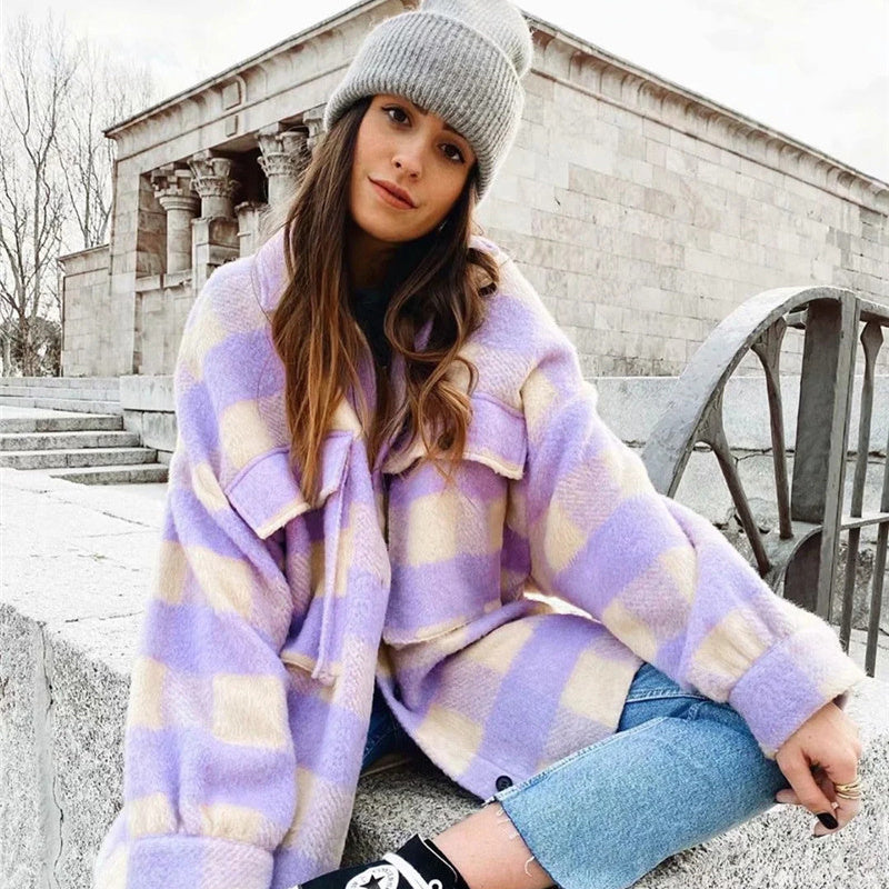 Casual Gewatteerde Geruite Losse Jas met Reverskraag in Europese en Amerikaanse Stijl voor Dames