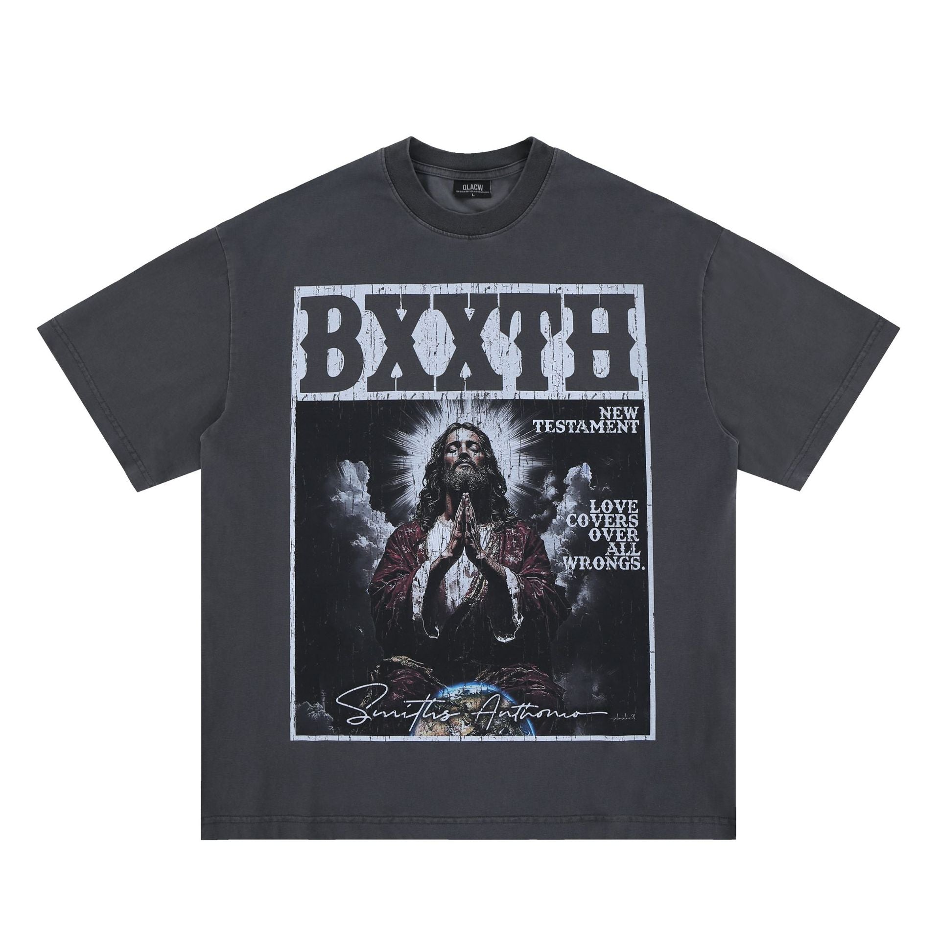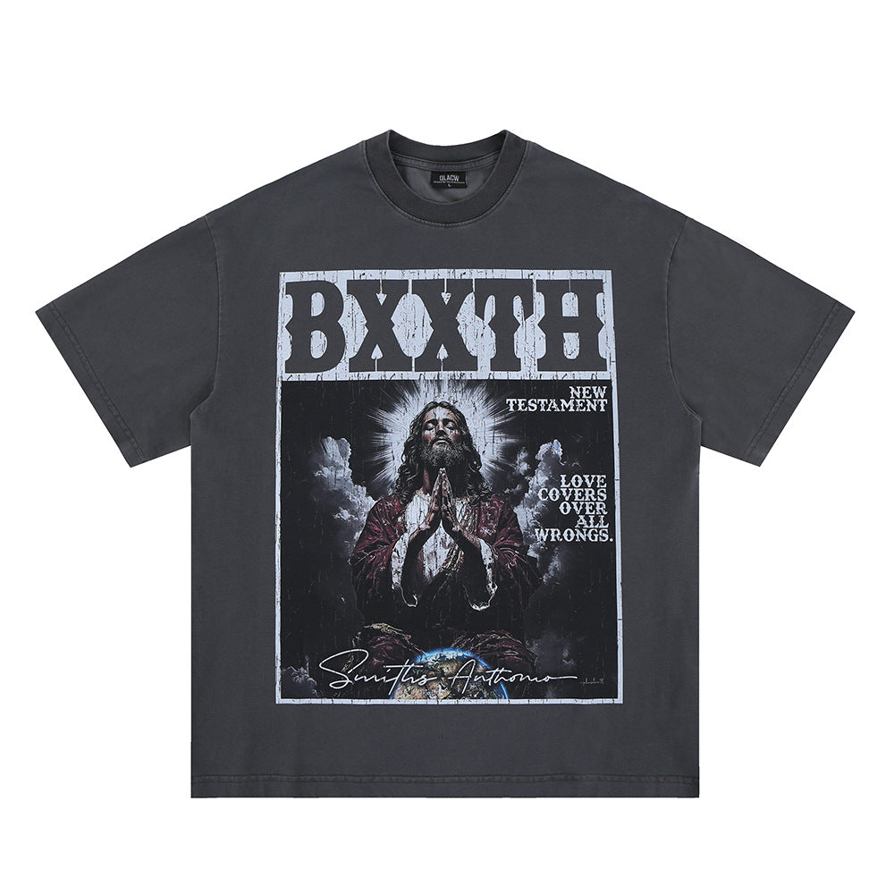 LANHAI Trendy Effen Kleur Oversized Casual Vintage Washed Ronde Hals T-shirt met Grafisch Bedrukte Gebedsprint en Korte Mouwen voor Heren